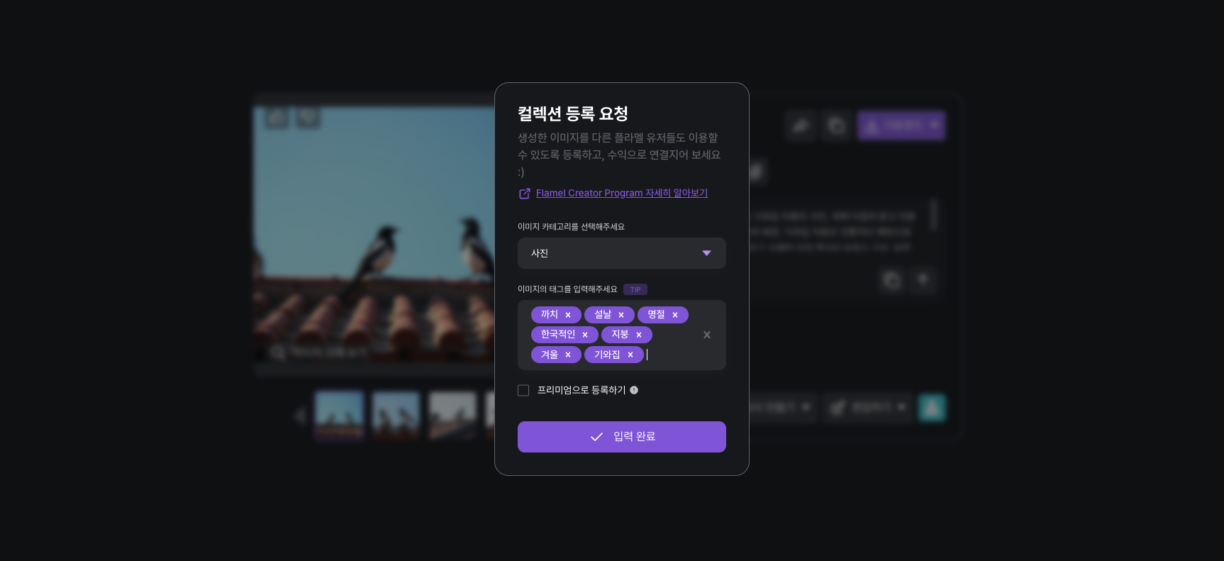 Join the Flamel Creator Program to create unique collections of Flamel. Submit your generated images for collection registration. Once approved, you can earn revenue from them.