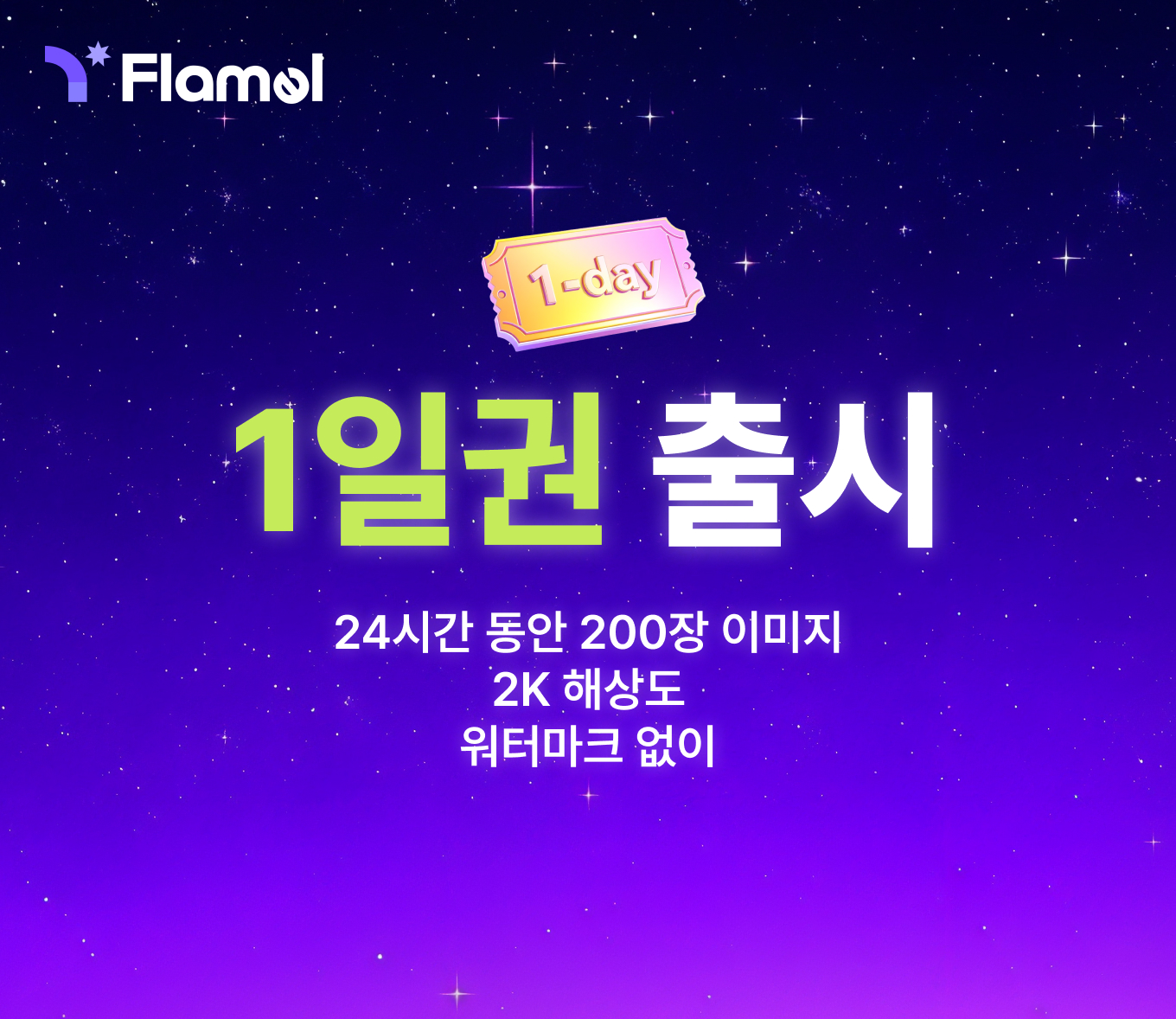 이미지 작업이 필요한 순간, 짧은 기간 동안 몰아서 작업하고 싶으셨죠? 이제 그 고민을 해결할 수 있는 "1일권"을 소개합니다!하루 동안 최대 200장의 이미지를 생성하고, 2K 해상도의 고품질 이미지를 워터마크 없이 다운로드하세요.